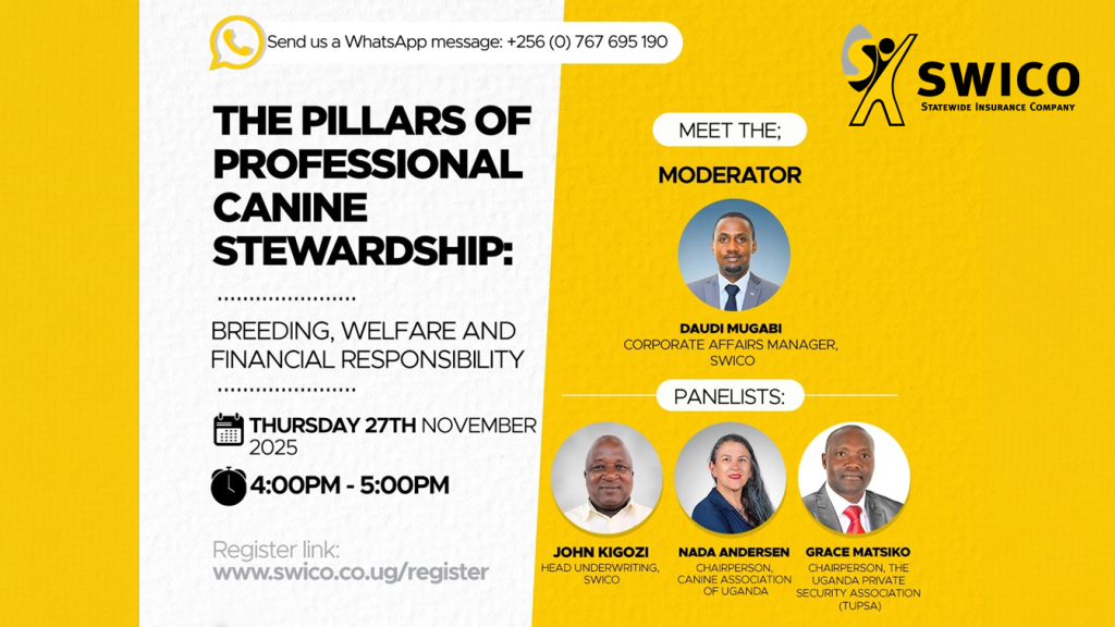 This webinar features a distinguished panel of leaders from Uganda’s canine community, including Nada Andersen from the Canine Association of Uganda, Grace Matsiko from The Uganda Private Securities Association, and John Kigozi, Head Underwriting at Statewide Insurance Company (SWICO). Our discussion will address current challenges in canine care, examine evolving standards for security dogs with emphasis on non-lethal protection, and demonstrate how insurance solutions complete the circle of professional responsibility.